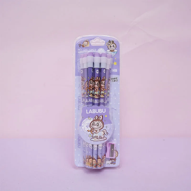 Labubu Anime Erasable Pencil Set – 12pcs Student Stationery with 0.5mm Refill & Break-Resistant Lead, Perfect Gift