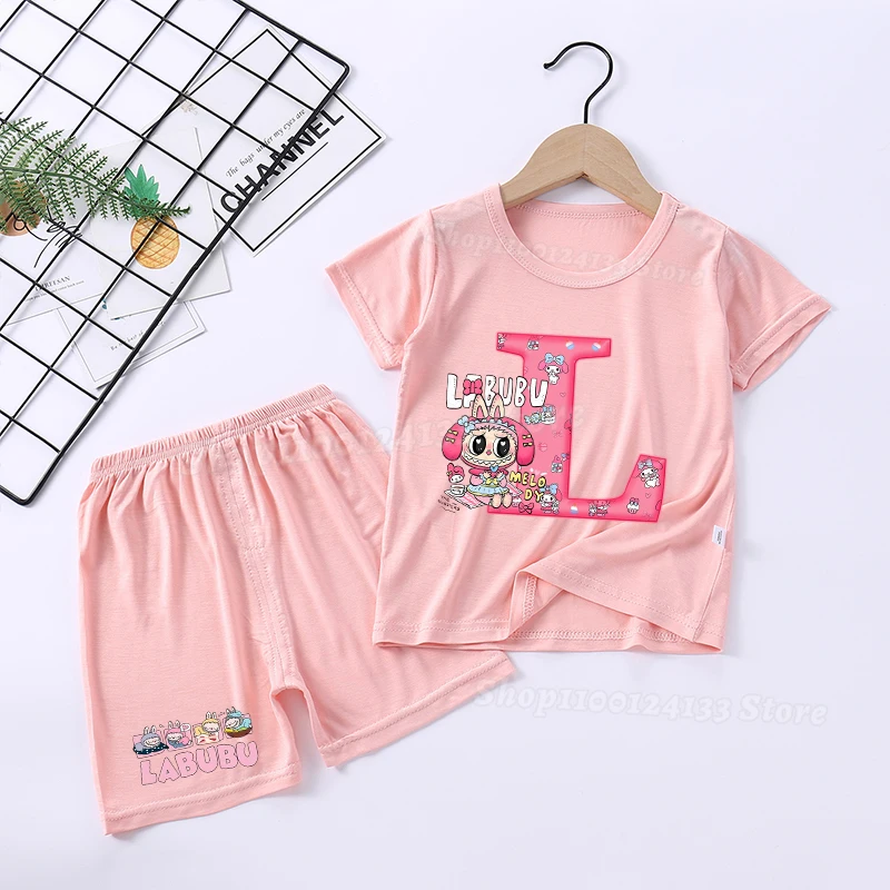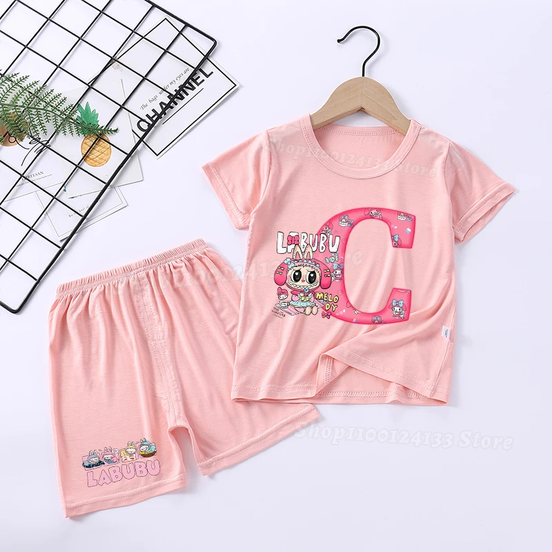 Labubu Melody Baby Pink Pajama Set – Cute Anime A-Z Print Sleepwear for Girls, Lightweight Short Sleeve & Kawaii Shorts